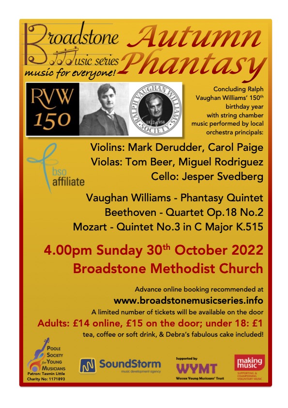In our final celebration of Vaughan Williams’ 150th birthday birthday this year through performing his music, in his birthday month they will perform his beautiful and melancholy 2 viola “Phantasy quintet”, as well as two more divine chamber pieces.
