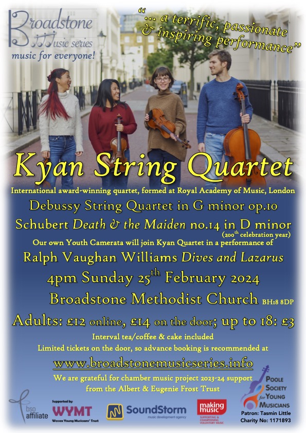 We are delighted to be welcoming this international, award-winning, string quartet, formed at the Royal Academy of Music and now on the professional circuit. The Kyan String Quartet will open our 2024 series with this exciting and popular programme.