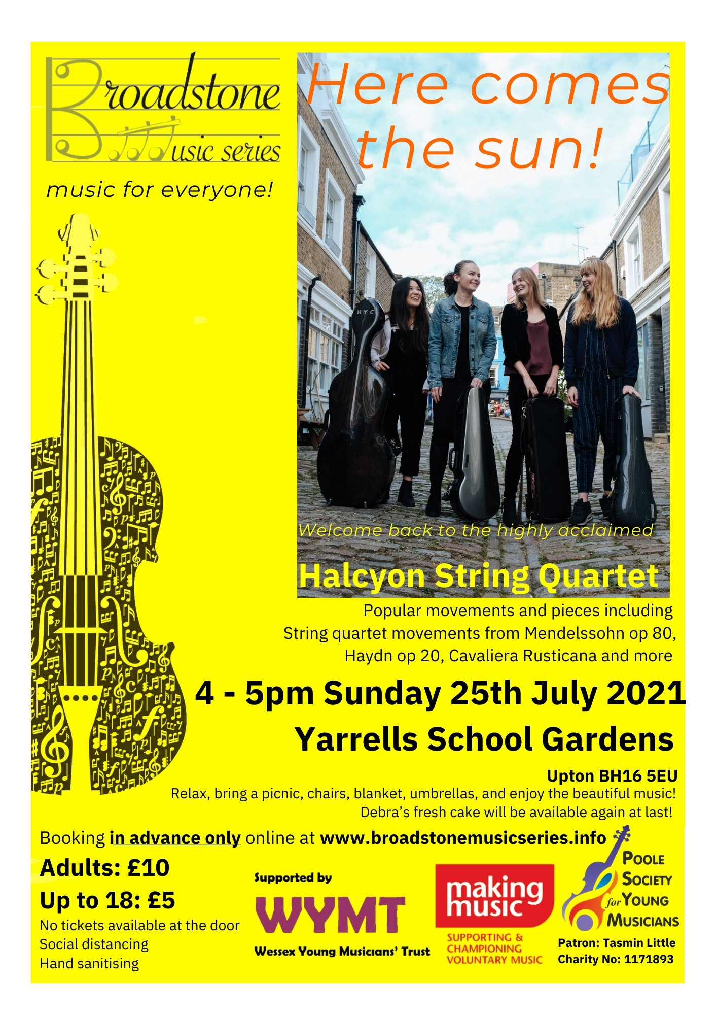 Our 2021 summer programme of public events continues with a return of the renowned Halcyon String Quartet presented in a COVID-19 secure way. We are delighted to welcome them back and they will perform for us in the beautiful Yarrells’ School Gardens before they begin as resident tutors on our annual summer school, 26th-28th July at Lytchett School.