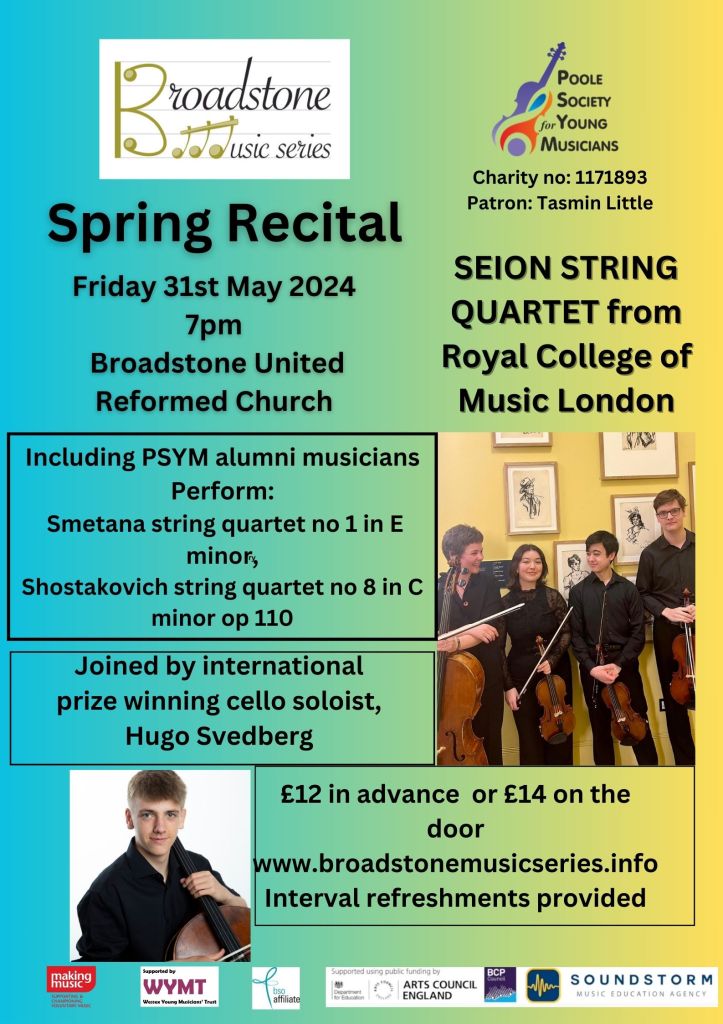 Two of the “Seion” string quartet members are alumni from our Poole Society for Young Musicians charity and many of our audience will recognise them so we are proud to present their recital.